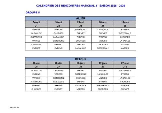 Voici le calendrier 2025-2026 de l'équipe du Club Sportif de La Saulce en National 3.